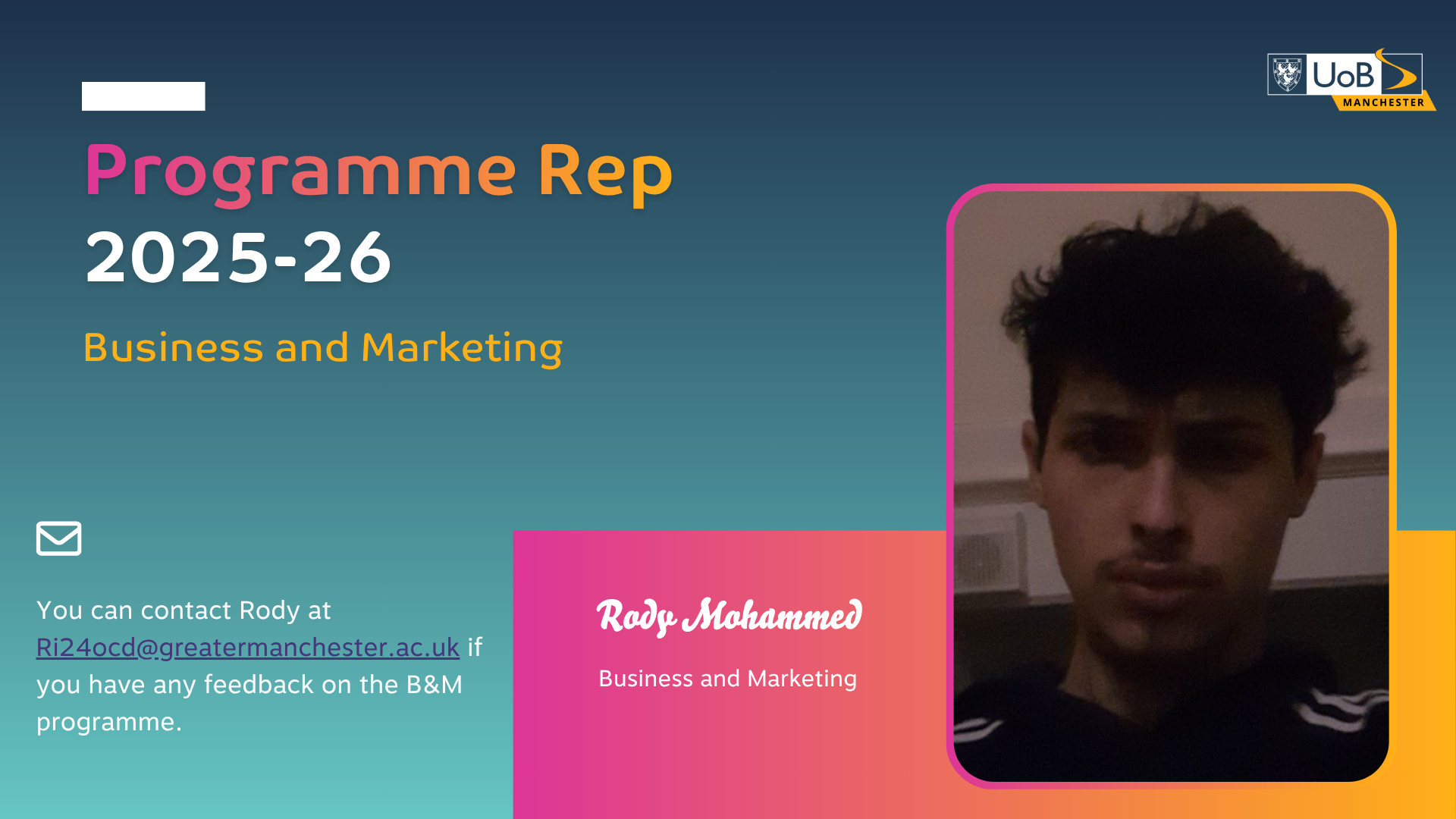There are plenty of opportunities to get involved with representing your student voice here at UoBM. In order to continuously improve the student experience, volunteer Programme Representatives are selected annually to represent the voice of the student population. If you are interested in becoming a Programme Rep, you will need to sign up for the election at the start of the academic year.